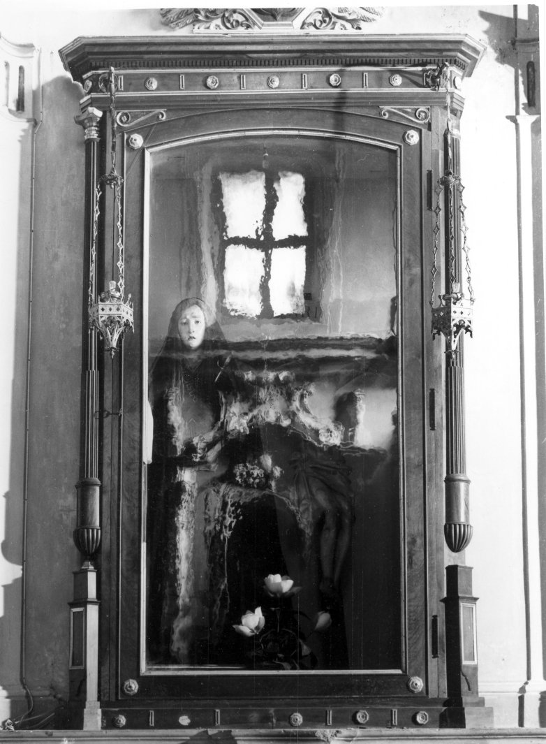 La nicchia è incorniciata da un prospetto ligneo chiuso da un battente a vetri. Su un basso basamento, ornato da borchie dorate ottagonali, si levano due semicolonne, poste in obliquo, poggianti su un alto dado ed aventi il corpo strigilato, baccellato e rastremato verso l'alto. Capitelli dorici e dorati. Serie di borchie dorate nel fregio e negli spigoli del battente. Sul coronamento due girali con fiori dorati affiancano uno stemma coronato con ruota centrale, tre stelle in alto ed uno in basso (Carrano?)