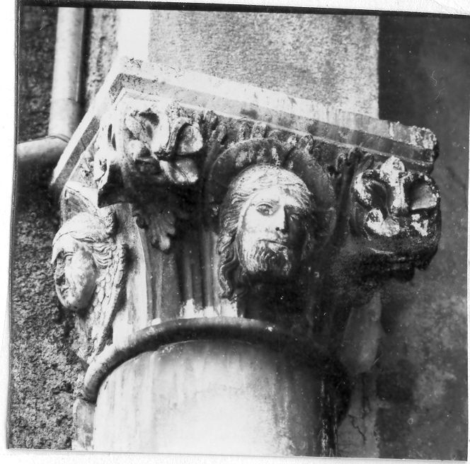 I capitelli sormontano quattro colonne, con la base decorata a motivi fogliacei stilizzati ed il fusto liscio, che sostengono tre archi nel portico antistante la facciata della chiesa. I capitelli sono decorati da motivi fogliacei, i simboli degli evangelisti, ritratti di dame e, il primo da sinistra, da una testa di cristo