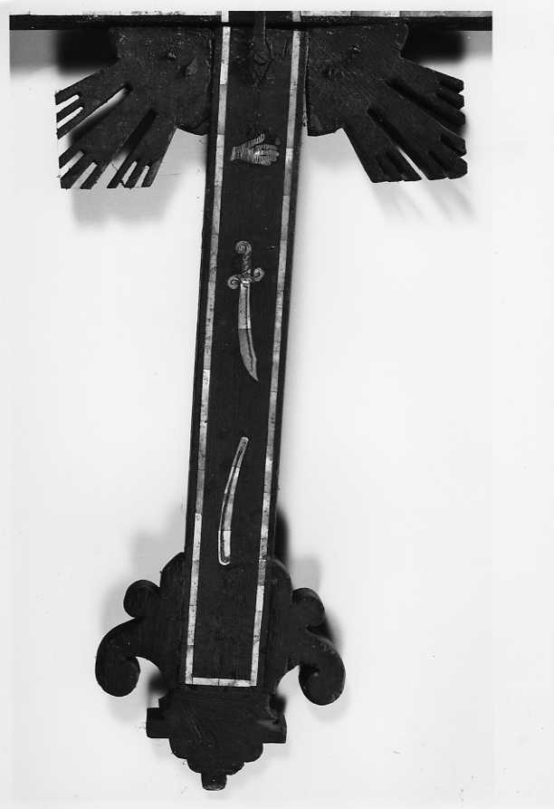 Croce in legno e madreperla. Sulla base di legno sono incastonati in madreperla strumenti di tortura