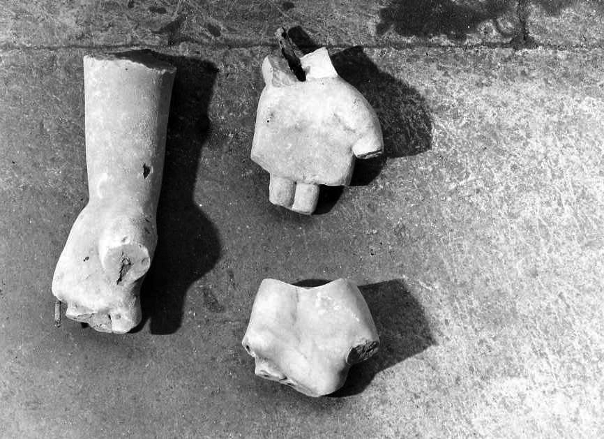 Gruppo di tre frammenti di sculture di mani sinistre di cui una presenta intatta l'attaccatura del polso fino al radio, mentre risulta danneggiata alle cinque dita. Degli altri due frammenti, il primo oltre ad essere tagliato al polso, di cui resta il perno di sostegno, risulta privato delle dita tranne che per la terza falange del pollice, del medio e dell'anulare; mentre il secondo, di migliore fattura, è tagliato al carpo ed è privo completamente delle dita