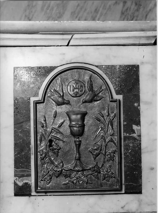 Su uno sfondo raggiato tra spighe e grappoli d'uva campeggia un calice verso cui si protendono due uccellini, sopra il calice un ostia col monogramma cristologico