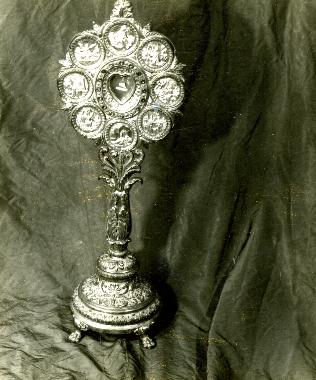 - NOTIZIE STORICO CRITICHE Oggetto eseguito su ordinazione. Il Di Capua scrive "....nel 1838, il can. Giovanni Giuseppe Longobardi .......premurò il Vescovo, Mons. Scanzano (1837/49), a richiedere parte delle reliquie di S. Catello che si trovava a Sorrento. La richiesta fu esaudita......Questa è la reliquia che.....viene esposta......nella Cattedrale". Notevolissimo interesse artistico e tecnico