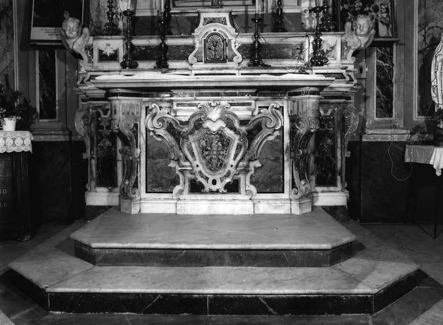 L'altare, con ciborio, presenta volute ai lati del paliotto e sul paliotto stesso, che reca al centro un motivo a due gradini. Vi sono angeli ai capi altare