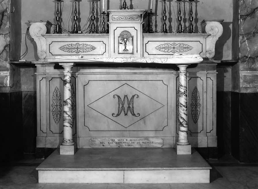 L'altare, con ciborio, presenta decorazioni a foglia ai lati del paliotto e del tabernacolo. Due colonnine reggono la mensa; vi sono volute ai capi altare. Il paliotto presenta al centro il monogramma di Maria. La predella è ad un gradino