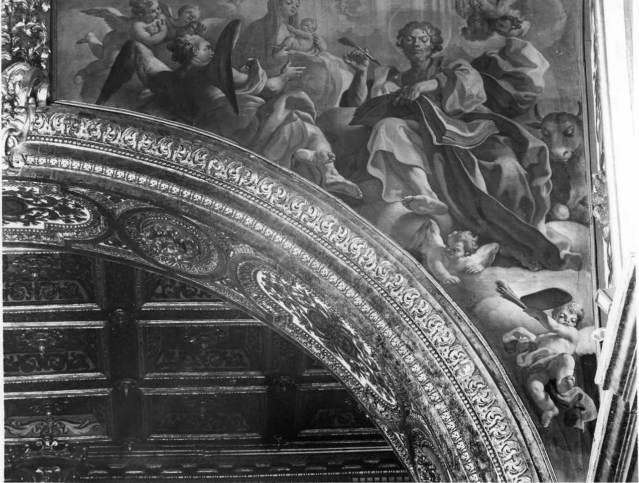 San Luca è seduto tra le nubi a scrivere su un enorme libro; indossa una veste azzurra ed un manto ocra. Attorno a lui si vedono angeli e cherubini; in basso un angioletto che reca i pennelli e la tavolozza, sulla destra il toro, ed in alto la Madonna con Bambino
