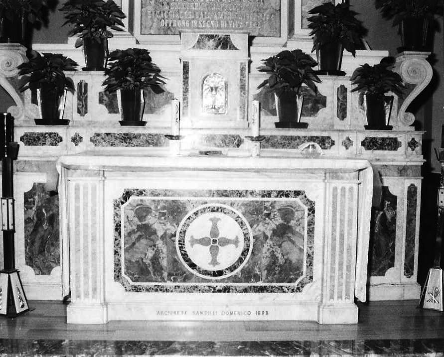 Altare in marmo; al centro del paliotto croce gigliata inserita in un cerchio; gradino d'altare con elementi a voluta terminanti. Al centro tabernacolo con porticina decorata da calice e raggiera