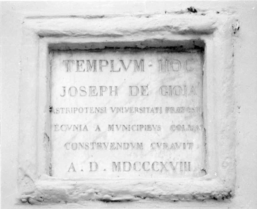 - ISCRIZIONI nel campo - TEMPLUM HOC/ JOSEPH DE GIOIA/ ATRIPOTENTI UNIVERSITATI PRAEPOSIUT/ EQUINIA A MUNICIPIBUS COLLAT/ COSTRUENDUM CURAVIT/ A.D. MDCCCXVIII - lettere capitali -