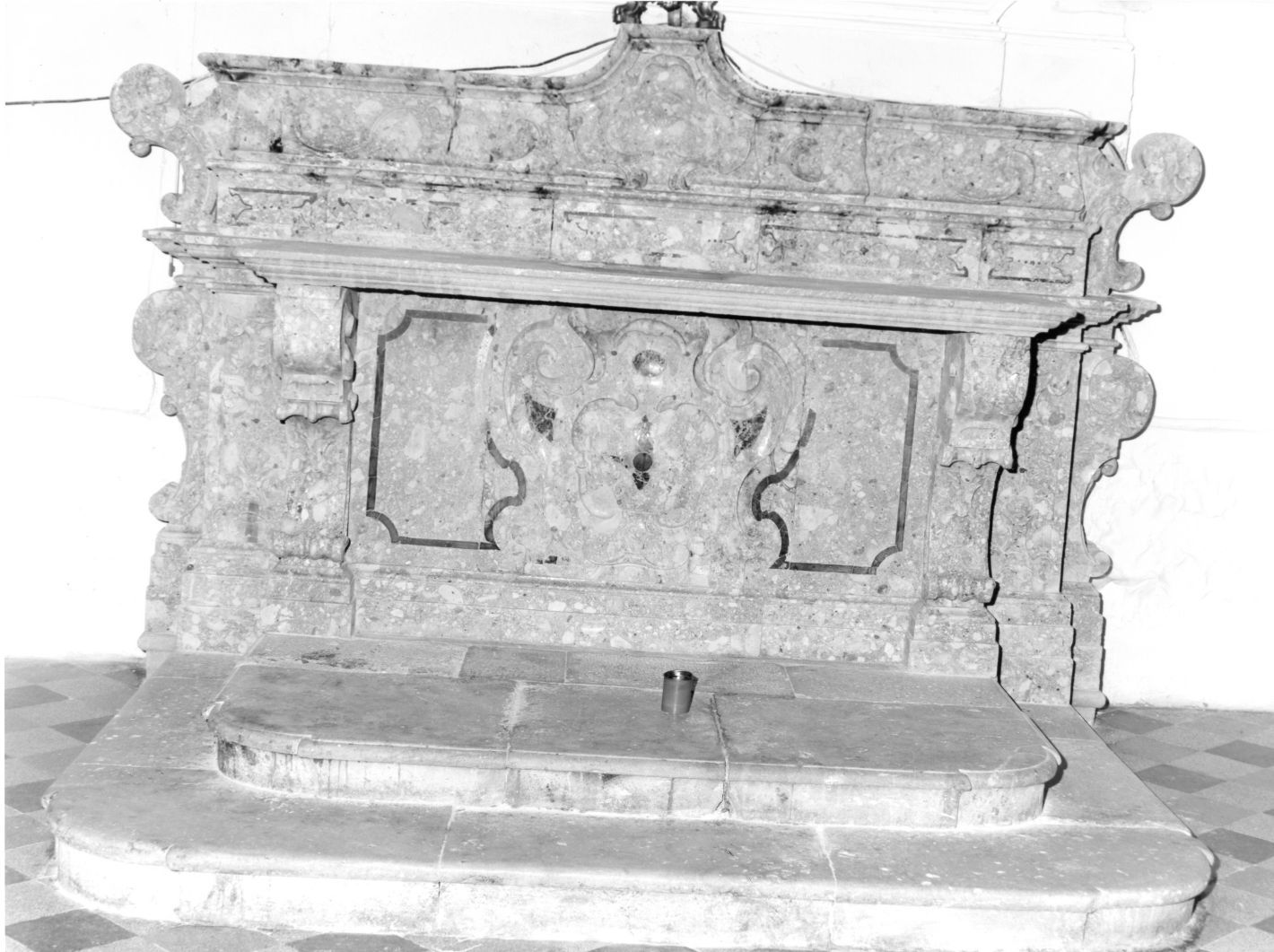 Le zone laterali dell'altare sono definite da volute finemente lavorate; la decorazione centrale è racchiusa da una cornice costituita da un sottile bordino nero