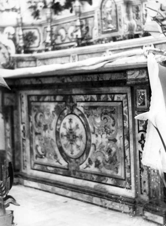 Altare con paliotto in marmo policromo a motivi ornamentali floreali