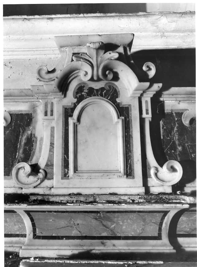 Tabernacolo in marmo scolpito ed intarsiato con motivi decorativi a volute