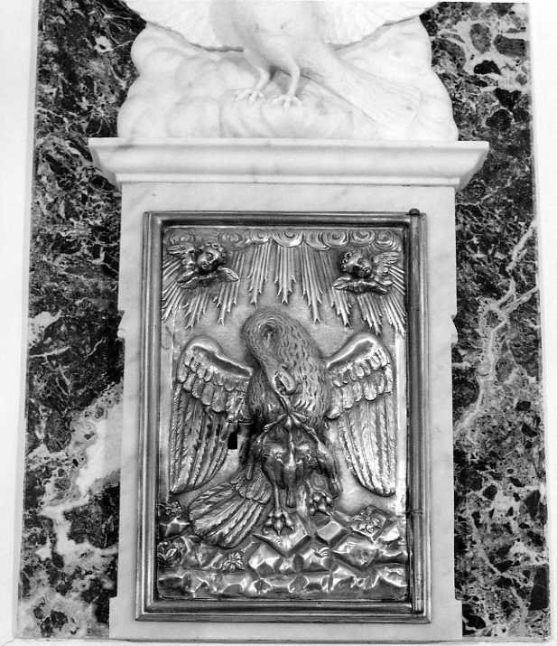 Sportello di tabernacolo raffigurante un pellicano con i suoi piccoli e in alto due angeli