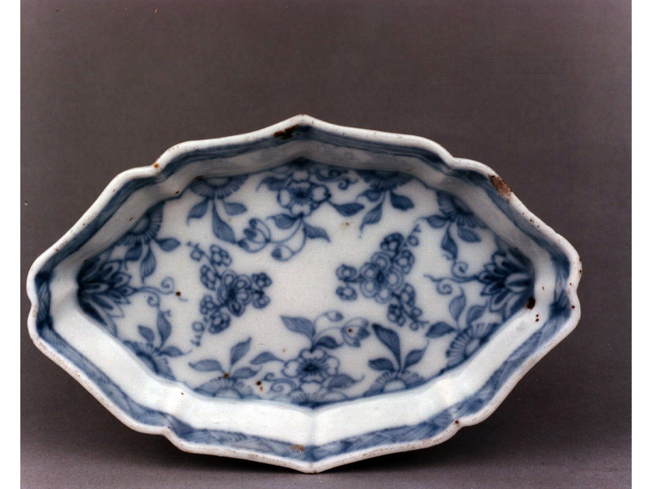 Piattino polilobato in porcellana dipinto in bianco e blu