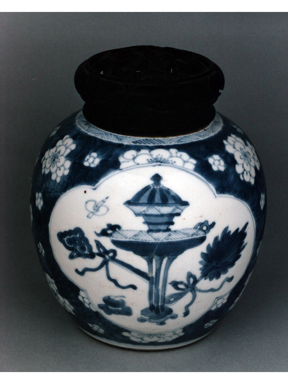 Vaso globulare con coperchio in porcellana dipinta bianca e blu. Il collo non è invetriato
