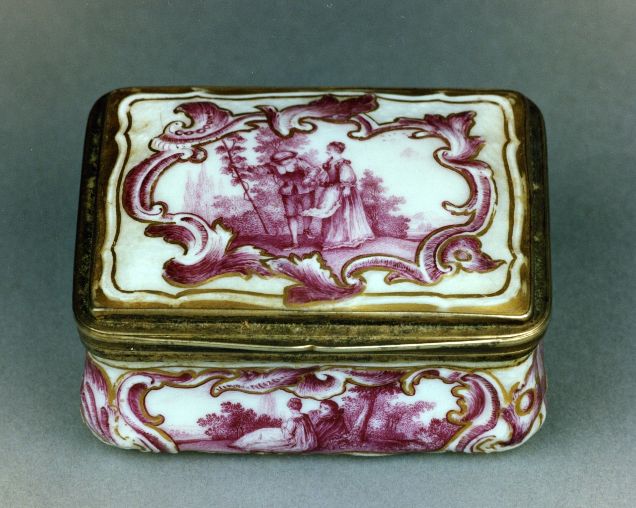 Tabacchiera in porcellana rettangolare sagomata, dipinta a monocromia cremisi su fondo bianco, dorato