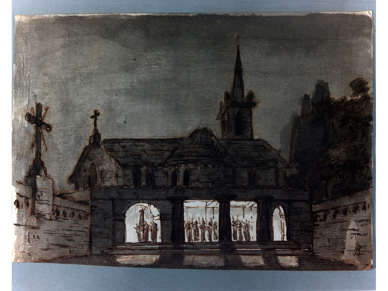 Schizzo scenografico raffigurante una chiesa affiancata da un porticato lungo il quale si muove una processione di fedeli, o di frati, con ceri e stendardo processionale
