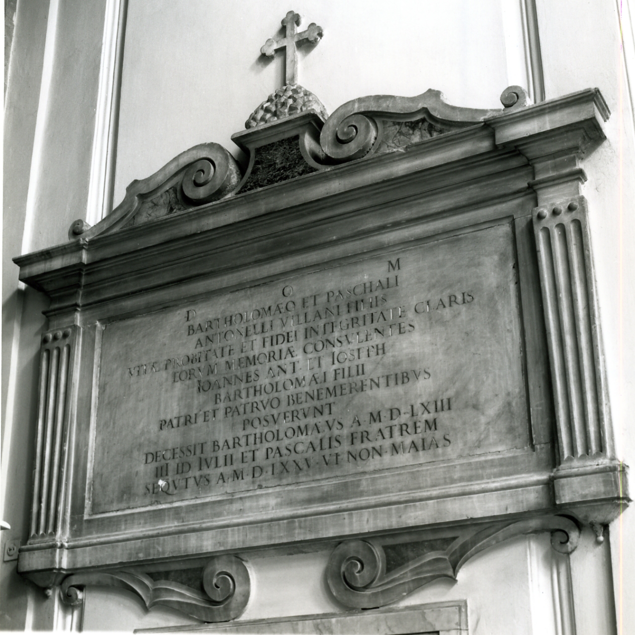 - ISCRIZIONI D.O.M. BARTHOLOMAEO ET PASCHALI/ ANTONELLI VILLANI FILIIS/ VITAE PROBITATE ET FIDEI INTEGRITATE CLARIS/ EORUM MEMORIAE CONSULENTES/ IOANNES ANT. ET IOSEPH/ BARTHOLOMEI FILII/ PATRI ET PATRUO BENEMERENTIBUS/ POSUERUNT/ DECESSIT BARTHOLOMAEUS A. MDLXIII/ III ID IULII ET PASCALIS FRATREM/ SEQUTUS A. MDLXXV VI NON MAIAS -