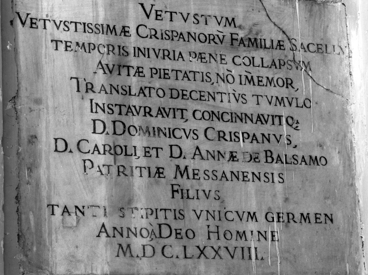 - ISCRIZIONI VETUSTUM/ VETUSTISSIMAE FAMILIAE SALELLUM/ TEMPORIS INIURIAE PAENE COLLAPSUM AVITAE PIETATIS NO MEMOR/ TRANSLATO DECENTIUS TUMULO/ INSTAURAVIT CONCINNAVITQ./ D. DOMINICUS CRISPANUS/ D. CAROLI ET D. ANNAE DE BALSAMO/ PATRITIAE MESSAENENSIS/ FILIUS/ TANTI STIPITIS UNICUM GERMEN/ ANNO A DEO HOMINE/ M.D.C. LXXVIII - lettere capitali -