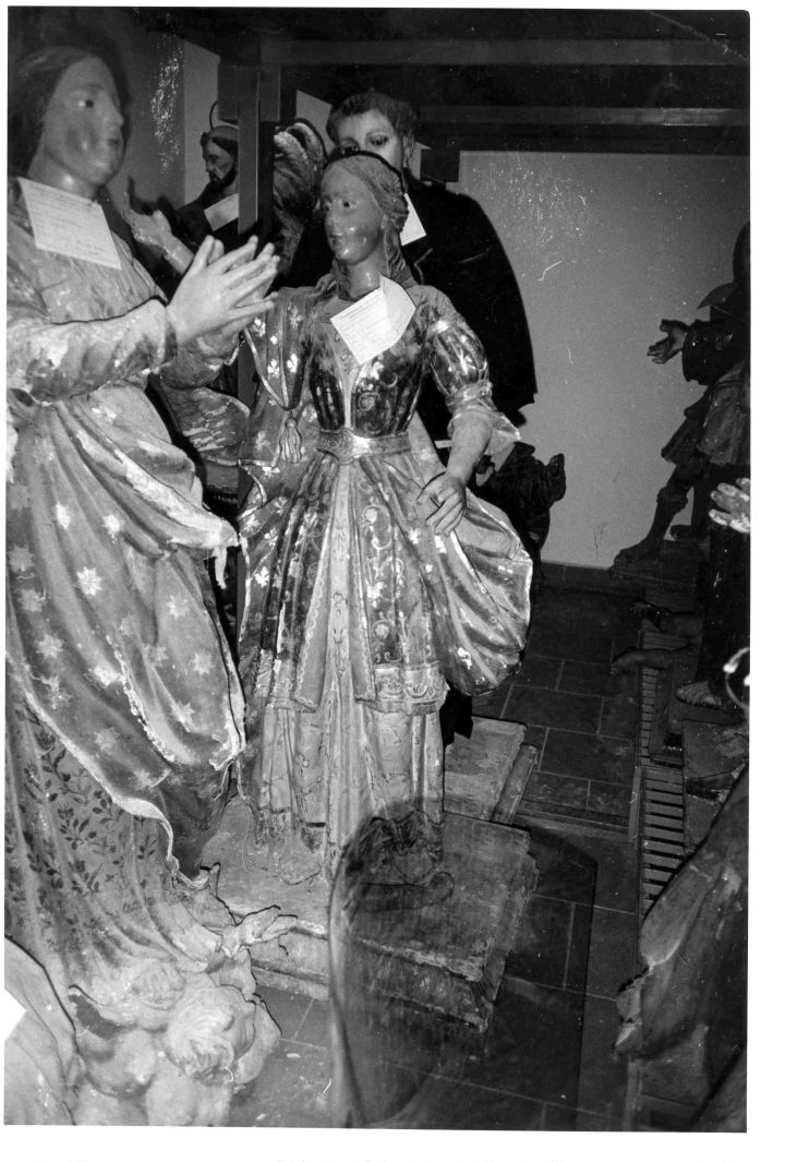 - NOTIZIE STORICO CRITICHE Databile ai primi decenni del secolo XIX, la statua devozionale,di fattura provinciale e dal rigido modellato, presenta arcaismi barocchi nella magniloquente gestualità nelle cadenze ornamentali accentuate, nelle cromie vivci e l'impreziosimento delle vesti di foggia fantasiosa. Trattasi di opera di bottega provinciale che interpreta ad effetto modelli aulici rispondenti alle esigenze di una committenza tradizionale