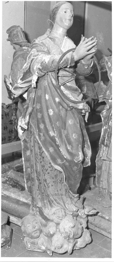 Figura devozionale intera della Madonna Immacolata poggiante su un nembo da cui compaiono due teste di cherubini, la mezzaluna e il serpente. Le braccia ripiegate in avanti con mani quasi congiunte. Capo scoperto con lunghi capelli discendenti sulle spalle. Veste rosa a motivi floreali dipinti a rosette, manto blu stellato in oro ricadente diagonalmente in mosse e pesanti pieghe