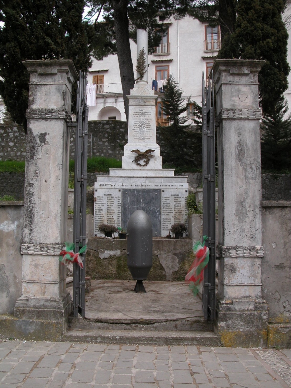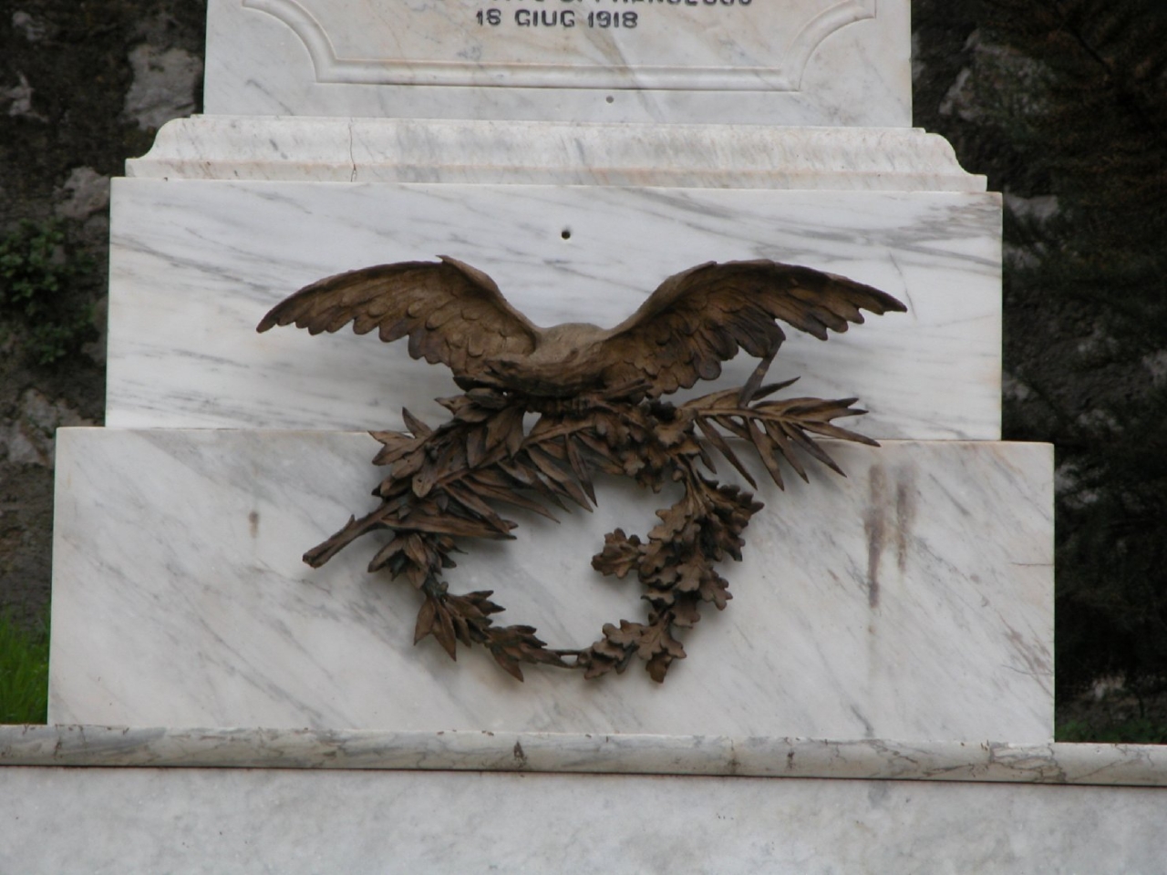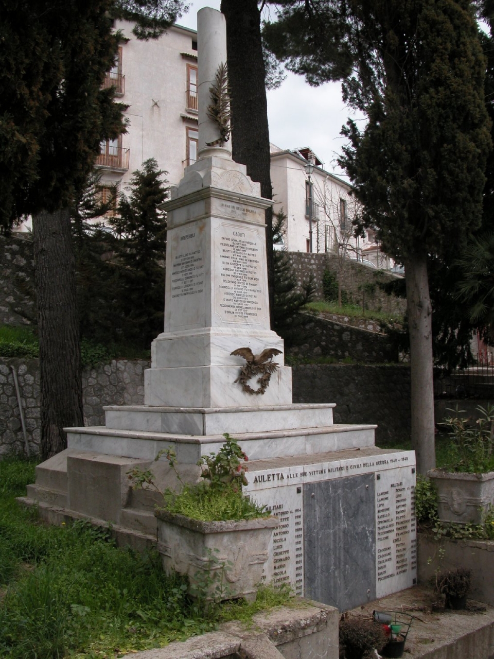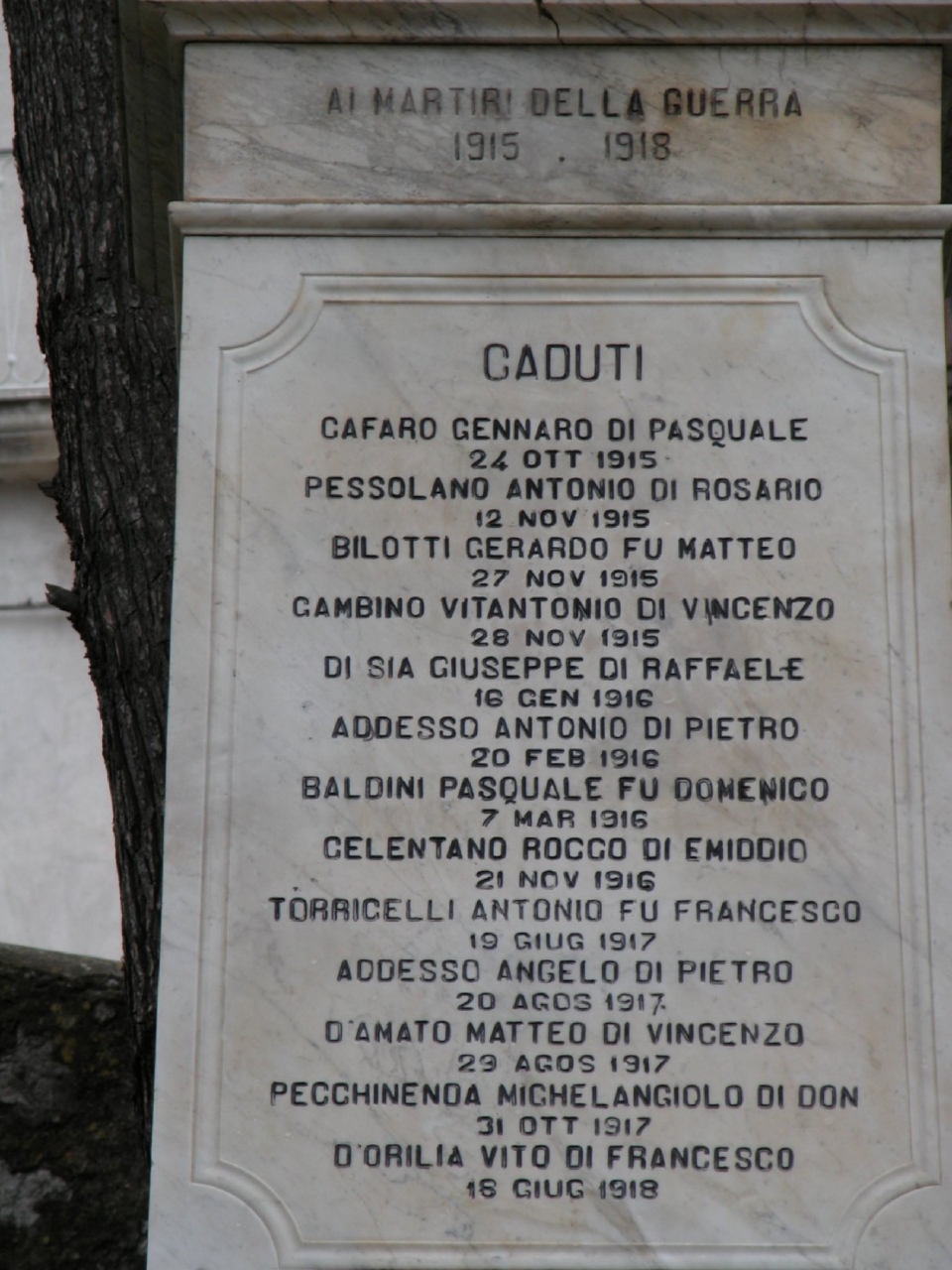 • ISCRIZIONI basamento/ lato anteriore/ in alto - AI MARTIRI DELLA GUERRA/ 1915 1918/ CADUTI/ CAFARO GENNARO DI PASQUALE/ 24 OTT 1915/ PESSOLANO ANTONIO DI ROSARIO/ 12 NOV 1915/ BILOTTI GERARDO FU MATTEO/ 27 NOV 1915/ GAMBINO VITANTONIO DI VINCENZO/ 28 NOV 1915/ DI SIA GIUSEPPE DI RAFFAELE/ 16 GEN 1916/ ADDESSO ANTONIO DI PIETRO/ 20 FEB 1916/ BALDINI PASQUALE FU DOMENICO/ 7 MAR 1916/ CELENTANO ROCCO DI EMIDDIO/ 21 NOV 1916/ TORRICELLI ANTONIO FU FRANCESCO/ 19 GIUG 1917/ ADDESSO ANGELO DI PIETRO/ 20 AGOS 1917/ D’AMATO MATTEO DI VINCENZO/ 29 AGOS 1917/ PECCHINENDA MICHELANGIOLO DI DON/ 31 OTT 1917/ D’ORILIA VITO DI FRANCESCO/ 18 GIUG 1918// - lettere capitali -