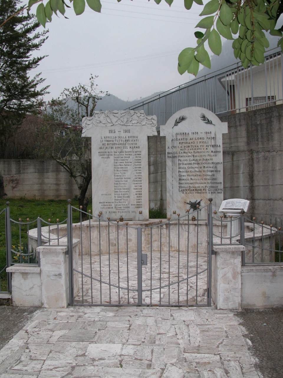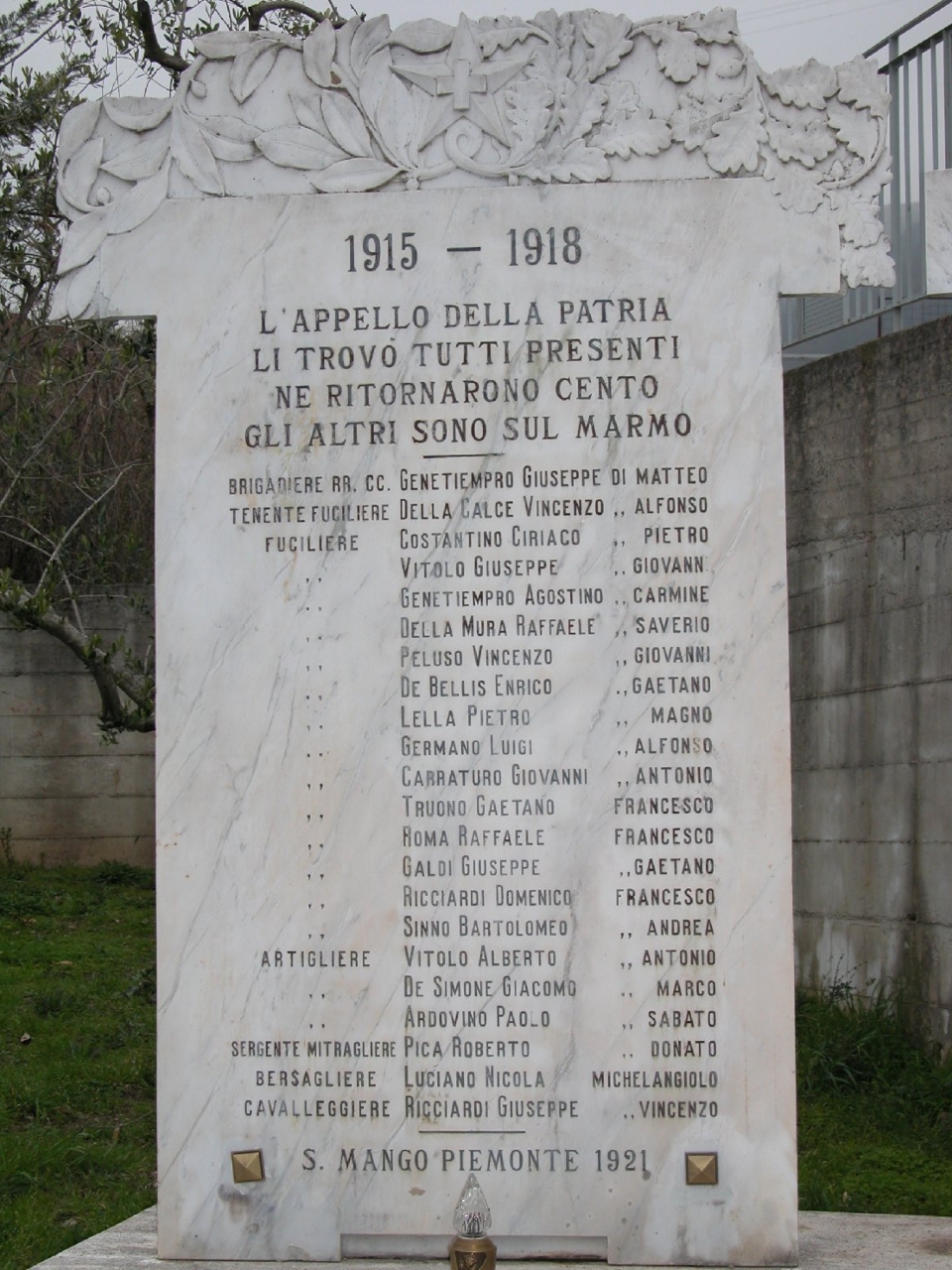 - ISCRIZIONI nel campo - L'APPELLO DELLA PATRIA/ LI TROVO' TUTTI PRESENTI/ NE RITORNARONO CENTO/ GLI ALTRI SONO SUL MARMO/ BRIGADIERE RR.CC. GENETIEMPRO GIUSEPPE DI MATTEO/ TENENTE FUCILIERE DELLA CALCE VINCENZO .. ALFONSO/ FUCILIERE COSTANTINO CIRIACO .. PIETRO/ VITOLO GIUSEPPE .. GIOVANNI/ GENETIEMPO AGOSTINO .. CARMINE/ DELLA MURA RAFFAELE .. SAVERIO/ PELUSO VINCENZO .. GIOVANNI/ DE BELLIS ENRICO .. GAETANO/ LELLA PIETRO .. MAGNO/ GERMANO LUIGI .. ALFONSO/ CARRATURO GIOVANNI .. ANTONIO/ TRUONO GAETANO FRANCESCO/ ROMA RAFFAELE FRANCESCO/ GALDI GIUSEPPE .. GAETANO/ RICCIARDI DOMENICO FRANCESCO/ SINNO BARTOLOMEO .. ANDREA/ ARTIGLIERE VITOLO ALBERTO .. ANTONIO/ DE SIMONE GIACOMO .. MARCO/ ARDOVINO PAOLO .. SABATO/ SERGENTE MITRAGLIERE PICA ROBERTO .. DONATO/ BERSAGLIERE LUCIANO NICOLA MICHELANGIOLO/ CAVALLEGGIERE RICCIARDI GIUSEPPE .. VINCENZO/ S. MANGO PIEMONTE 1921// - lettere capitali -
