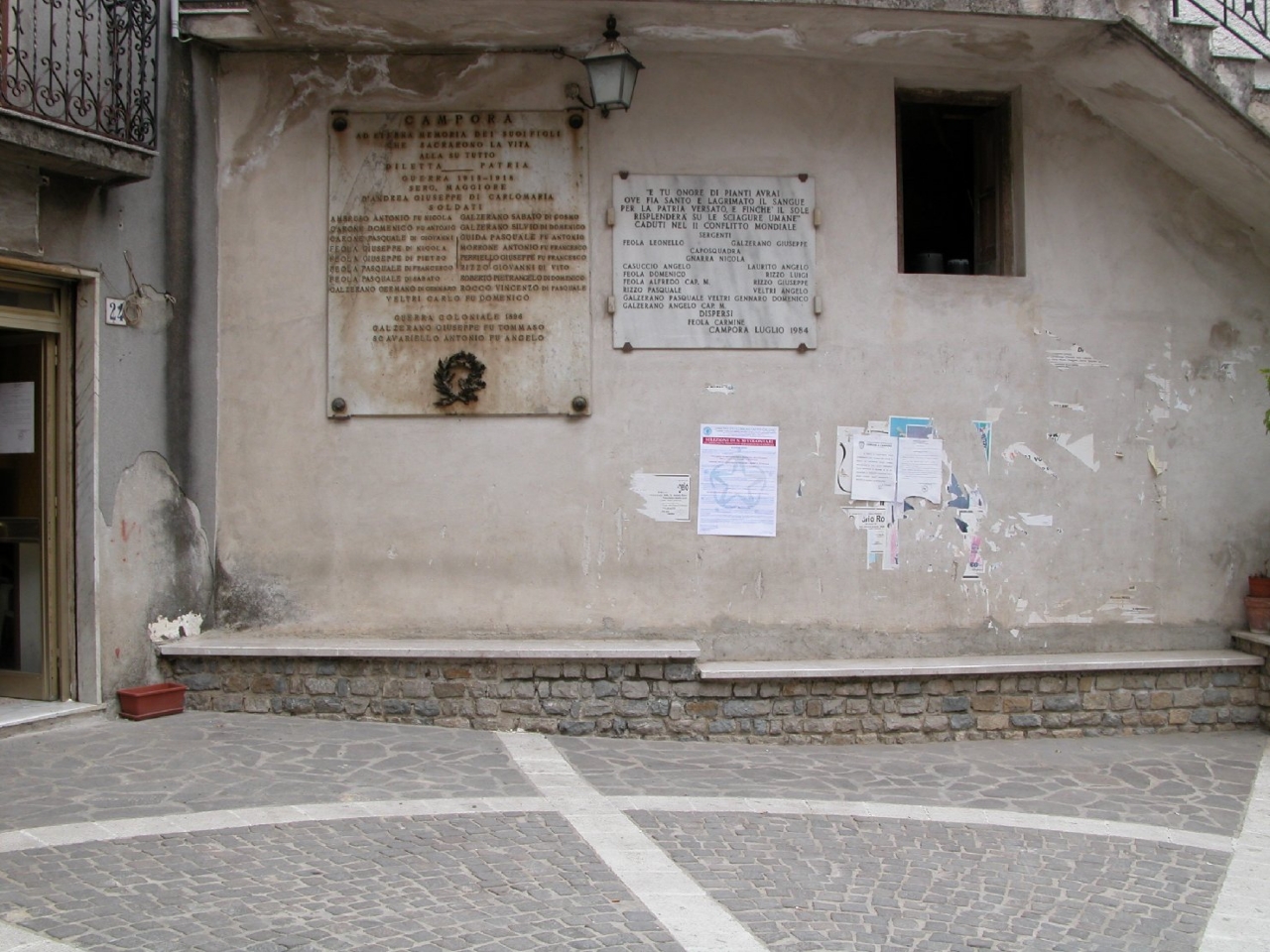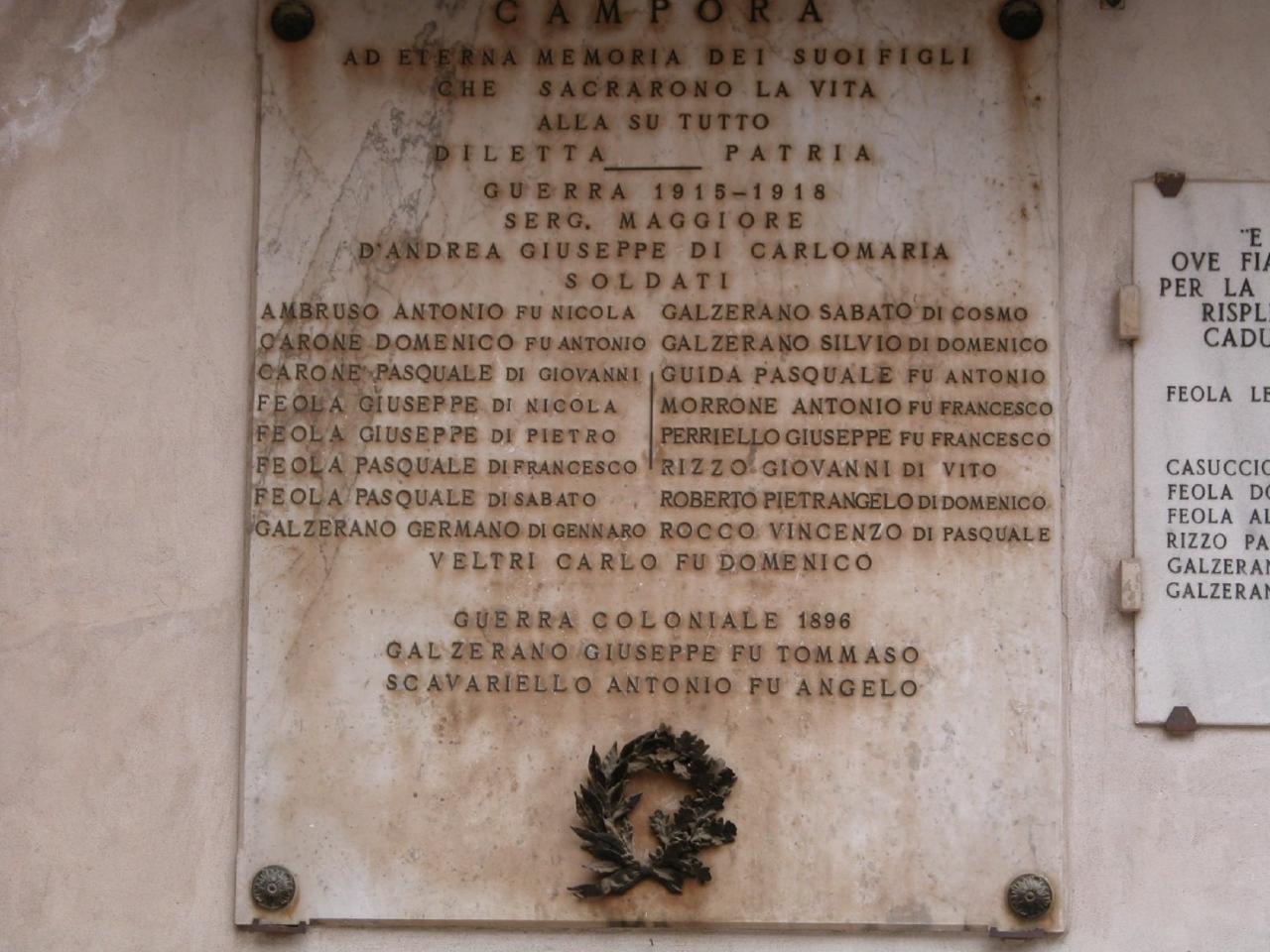 - ISCRIZIONI nel campo - CAMPORA/ AD ETERNA MEMORIA DEI SUOI FIGLI/ CHE SACRARONO LA VITA/ ALLA SU TUTTO/ DILETTA PATRIA/ GUERRA 1915 – 1918/ SERG. MAGGIORE/ D’ANDREA GIUSEPPE DI CARLOMARIA/ SOLDATI/ AMBRUSO ANTONIO FU NICOLA/ CARONE DOMENICO FU ANTONIO/ CARONE PASQUALE DI GIOVANNI/ FEOLA GIUSEPPE DI NICOLA/ FEOLA GIUSEPPE DI PIETRO/ FEOLA PASQUALE DI FRANCESCO/ FEOLA PASQUALE DI SABATO/ GALZERANO GERMANO DI GENNARO/ GALZERANO SABATO DI COSMO/ GALZERANO SILVIO DI DOMENICO/ GUIDA PASQUALE FU ANTONIO/ MORRONE ANTONIO FU FRANCESCO/ PERRIELLO GIUSEPPE FU FRANCESCO/ RIZZO GIOVANNI DI VITO/ ROBERTO PIETRANGELO DI DOMENICO/ ROCCO VINCENZO DI PASQUALE/ VELTRI CARLO FU DOMENICO/ GUERRA COLONIALE 1896/ GALZERANO GIUSEPPE FU TOMMASO/ SCAVARIELLO ANTONIO FU ANGELO// - lettere capitali -