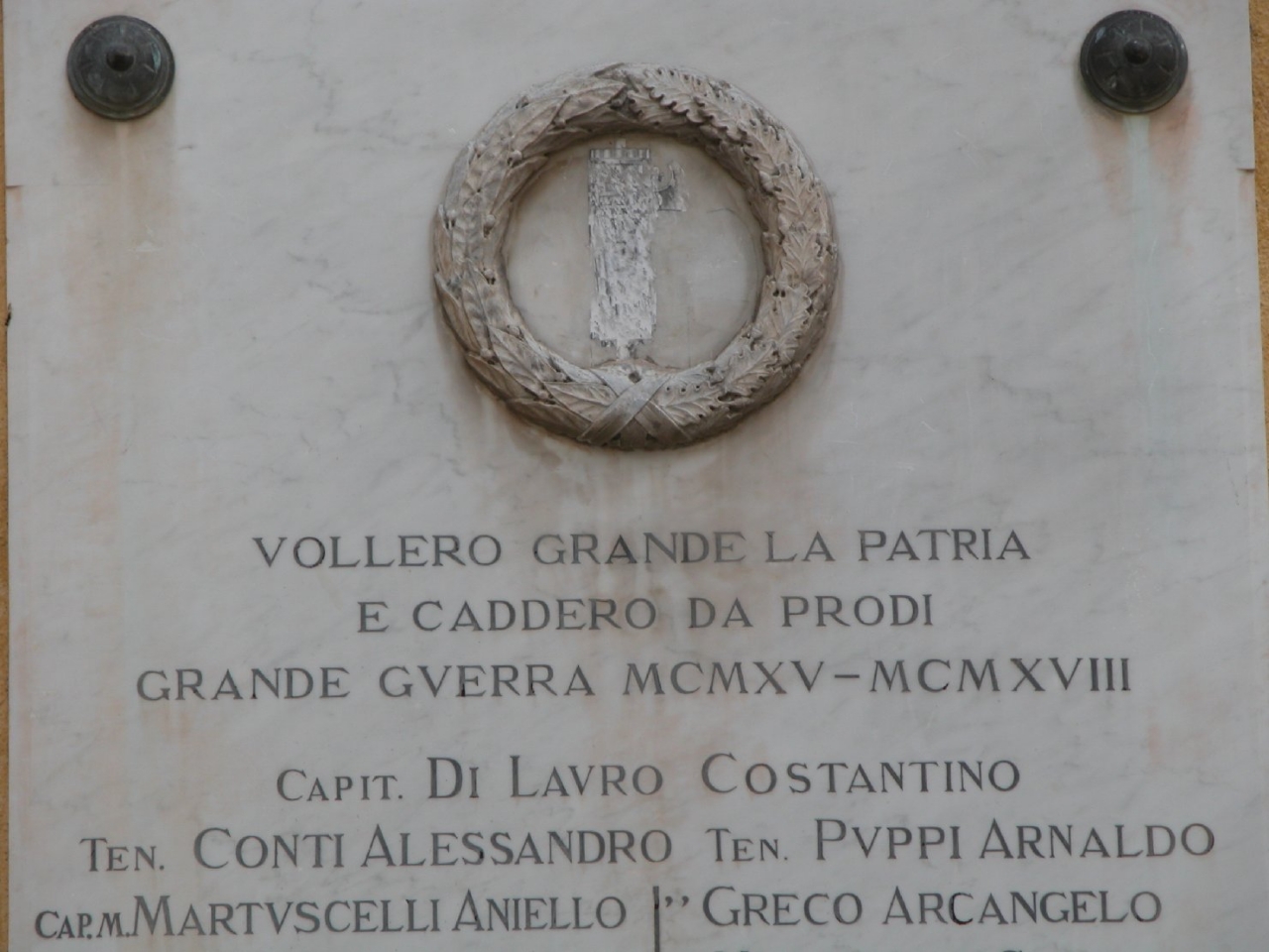 - ISCRIZIONI nel campo - VOLLERO GRANDE LA PATRIA/ E CADDERO DA PRODI/ GRANDE GUERRA MCMXV-MCMXVIII/ CAPIT. DI LAURO COSTANTINO/ TEN. CONTI ALESSANDRO TEN. PUPPI ARNALDO/ CAP. M. MARTUSCIELLI ANIELLO/ CAP. CUTRI DOMENICO/ D’AMICO GIUSEPPE/ GRECO LUIGI/ PERROTTA ALFONSO/ SOLD. AMETRANO ANTONIO/ AVELLA ALFONSO/ BARONE ROCCO/ CARRIOLA VINCENZO/ D’ALESSANDRO ANIELLO/ D’ARIENZO ANIELLO/ GASPARRI GIOVANNI/ GRECO ARCANGELO/ MARSICANO SALVATORE/ OTTATI ANIELLO/ MARTUSCELLI GIUSEPPE/ PALMA ANGELO/ PISANI ANGELO/ PUGLIA CARMINE/ SACCHI GENNARO/ SANSALONE ANTONIO/ SAULLO ALFONSO/ TRANCREDI CARMINE/ VISTOCCO EMILIO/ PISCIOTTA MEMORE/ XXIV V MCMXXVII A.V E.F.// - lettere capitali -