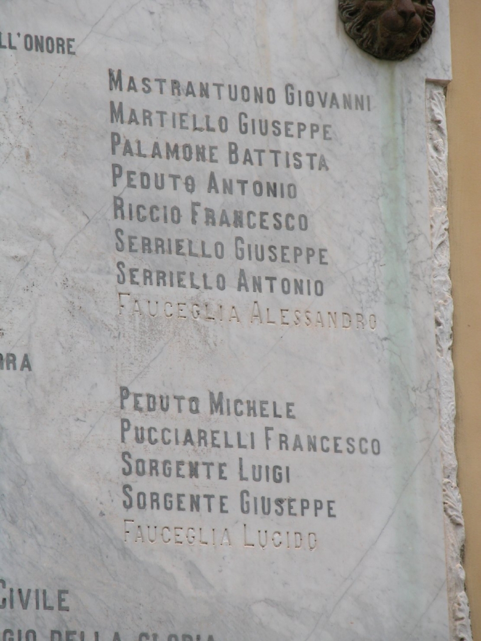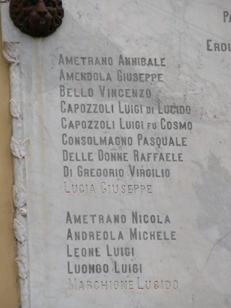 - ISCRIZIONI nel campo - IV GUERRA DELL'INDIPENDENZA NAZIONALE/ PER UNA PIÙ GRANDE ITALIA/ PARTECIPARONO 400 SOLDATI AQUARESI. EROICAMENTE CADDERO SUL CAMPO DELL’ONORE/ AMETRANO ANNIBALE/ AMENDOLA GIUSEPPE/ BELLO VINCENZO/ CAPOZZOLI LUIGI DI LUCIDO/ CAPOZZOLI LUIGI FU COSMO/ CONSOLMAGNO PASQUALE/ DELLE DONNE RAFFAELE/ DI GREGORIO VIRGILIO/ LUCIA GIUSEPPE/ DORATO TEODORO/ FAUCEGLIA GIOSUE’/ GIGLIELLO VINCENZO/ LEVI LUCIDO/ LUONGO GIUSEPPE/ LUONGO GIOVANNI/MARINO MICHELE FU LUCIDO/ MARINO FRANCESCO/ MASTRANTUONO GIOVANNI/ MARTINIELLO GIUSEPPE/ PALAMONE BATTISTA/ PEDUTO ANTONIO/ RICCIO FRANCESCO/ SERRIELLO GIUSEPPE/ SERRIELLO ANTONIO/ FAUCEGLIA ALESSANDRO/ ED A CAUSA DEL SERVIZIO DI GUERRA/ AMETRANO NICOLA/ ANDREOLA MICHELE/ LEONE LUIGI/ LUONGO LUIGI/ MARCHIONE LUCIDO/ MARINO MICHELE DI LUCIDO/ NICOLETTA ANTONIO/ PEDUTO NICOLA/ PEDUTO AMEDEO/ PEDUTI MICHELE/ PUCCIARELLI FRANCESCO/ SORGENTE LUIGI/ SORGENTE GIUSEPPE/ FAUCEGLIA LUCIDO/ LA PATRIA ORGOGLIOSA/ IL MUNICIPIO ED IL COMITATO CIVILE/ NE CONSACRANO I NOMI AL PERENNE FASTIGIO DELLA GLORIA/ 1920// - lettere capitali - a incisione - italiano