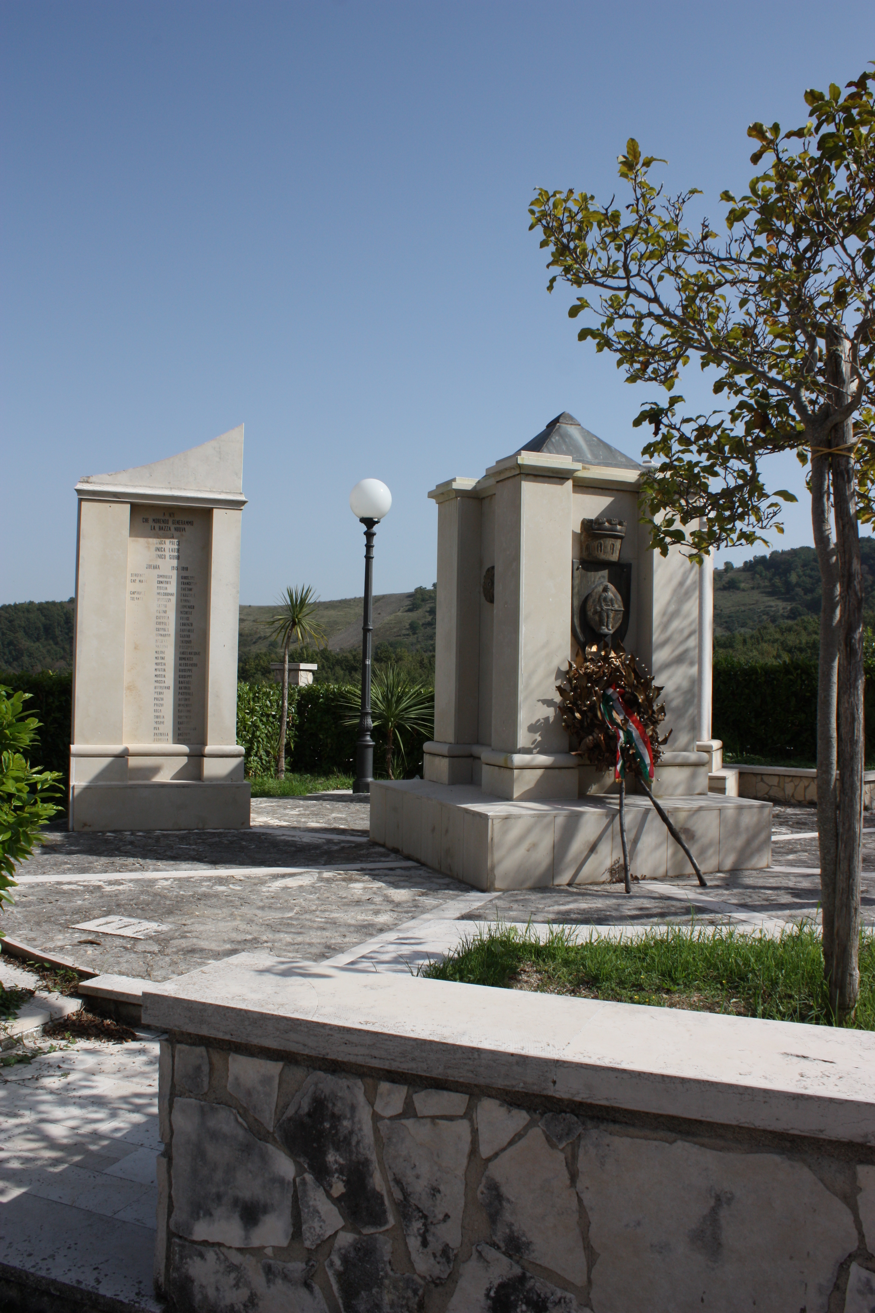 - ISCRIZIONI edicola di sinistra/ lato anteriore - A NOI/ CHE MORENDO GENERAMMO/ LA RAZZA NUOVA/ ITALIA/ UNICA PRECE/ UNICA LAUDE/ UNICO GIURO/ GUERRA 1915-1918/ SERGENTE SIMONELLI GIUSEPPE/ CAP. MAGG. CONFORTI FRANCESCO/ SIBILIA GAETANO/ CAPORALE MELCHIONNO PASQUALE/ SOLDATO BOCCUZZI SABINO/ CATINO DOMENICO/ CATINO MICHELE/ COPPOLA FELICE/ COPPOLA LORENZO/ COPPOLA RAFFAELE/ LEONARDO SABINO/ MARENA ANTONIO/ MARTINO PASQUALE/ MILONE ANGELANTONIO/ MILONE DOMENICO/ MOCCIA ALESSANDRO/ MOCCIA GIUSEPPE/ MOCCIA GIUSEPPE/ MOCCIA SALVATORE/ OTTAVIANO ANTONIO/ PIERNI PASQUALE/ PRIZIO ANTONIO/ PRIZIO DOMENICO/ ROSA GIOVANNI/ SIBILIA GIACINTO/ TOSONE RAFFAELE/ UVA ALESSANDRO/ ZARRELLA ANTONIO/ ZARRELLA GIUSEPPE// - lettere capitali -