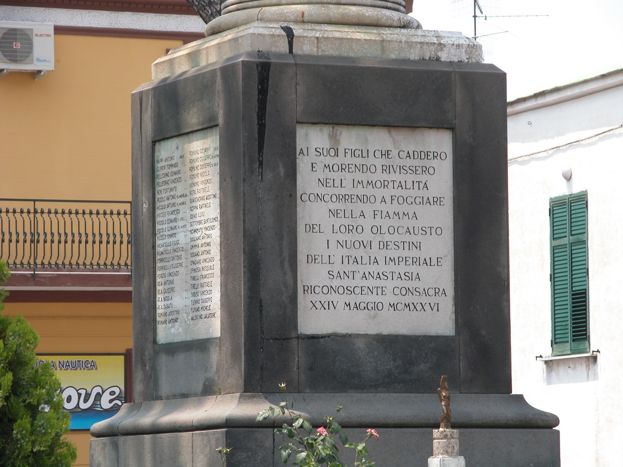 - ISCRIZIONI basamento/ lato anteriore - AI SUOI FIGLI CHE CADDERO/ E MORENDO RIVISSERO/ NELL'IMMORTALITA'/CONCORRENDO A FOGGIARE/ NELLA FIAMMA/ DEL LORO OLOCAUSTO/ I NUOVI DESTINI/ DELL'ITALIA IMPERIALE/ SANT'ANASTASIA/ RICONOSCENTE CONSACRA/ XXIV MAGGIO MCMXXVI// - lettere capitali - a incisione - italiano