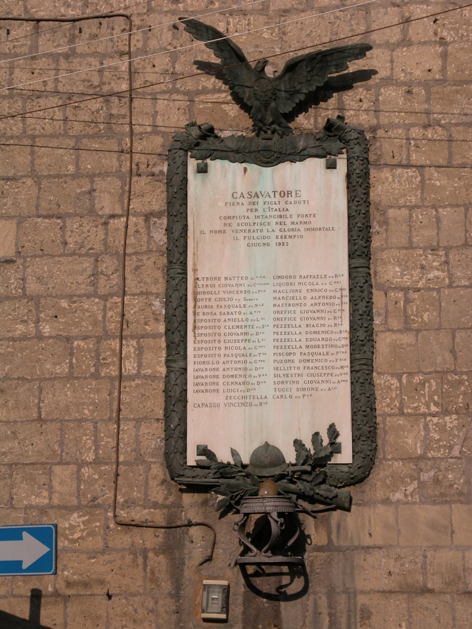 - ISCRIZIONI nel campo - CASAVATORE/ FIERA DEI FIGLI CADUTI/ PER L'ITALIA/ COMPIUTA INTANGIBILE FORTE/ NE SCOLPISCE NEL MARMO/ IL NOME VENERATO LA GLORIA IMMORTALE/ IL FULGIDO ESEMPIO/ GIUGNO 1923/ALTRONE MATTEO DI A.C.P./ ALTRUI GIOVANNI FU GIULIANO/ CHIROLLI VINCENZO FU P.LE/ CONTE GIULIO FU SABATO/ D’AURIA PASQUALE FU N.LE/ DE ROSA SABATO A.NIO/ ESPOSITO ANIELLO FU L.GI/ ESPOSITO CLEMENTE FU S.LO/ ESPOSITO GIOVANNI DI D.CO/ ESPOSITO GIUSEPPE DI L.GI/ ESPOSITO NICOLA DI G.NNI/ ESPOSITO PASQUALE DI T.SO/ FIORILLO ANTONIO DI G.PPE/ IAVARONE ANTONIO DI D.CO/ IAVARONE DOMENICO DI V.IO/ IAVARONE GENNARO DI D.CO/ IAVARONE LUIGI FU D.CO/ LINDORO RAFFAELE FU R.LE/ LIQUORI NICOLA FU G.NNI/ MAGLIONE ENRICO FU G.NNI/ MARCIELLO ALFREDO DI V.ZO/ MASTRONZO ANTONIO FU V.ZO/ OREFICE GIOVANNI FU G.PPE/ OREFICE GIOVANNI DI R.LE/ PEZZELLA BIAGIO FU R.LE/ PEZZELLA DOMENICO FU R.LE/ PEZZELLA EDUARDO FU G.PPE/ PEZZELLA MODESTINO DI R.LE/ PISCOPO PASQUALE DI P.TRO/ PUZONE DOMENICO FU F.SCO/ SELLITTO FRANCESCO FU M.LE/ SILVESTRI GIUSEPPE FU V.ZO/ SORVINO GIOVANNI DI A.DRO/ TUCCI SIMONE FU A.LO/ ZECCHITELLA CARLO FU P.LE/ CAPASSO VINCENZO FU R.LE// - lettere capitali - a incisione - italiano