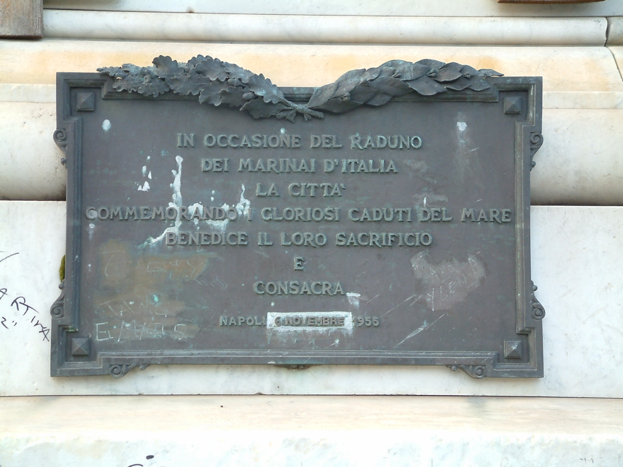 - ISCRIZIONI basamento/ lato anteriore - AI CADUTI COMBATTENDO/ SUL MARE/ IN OGNI TEMPO E DOVUNQUE/ NEL NOME E PER LA GLORIA D'ITALIA/ INIZIANDO LA PATRIA LE SUE NUOVE FORTUNE/ SUL MARE/ NAPOLI/ CHE RICCHEZZE POTENZA EROI EBBE ED ATTENDE/ DAL MARE/ QUESTO SEGNO MARMOREO DI SUA ANTICA CIVILTA'/ NEL DI NATALE DI ROMA DEL MCMXIV/ POSE// - lettere capitali - a incisione - italiano