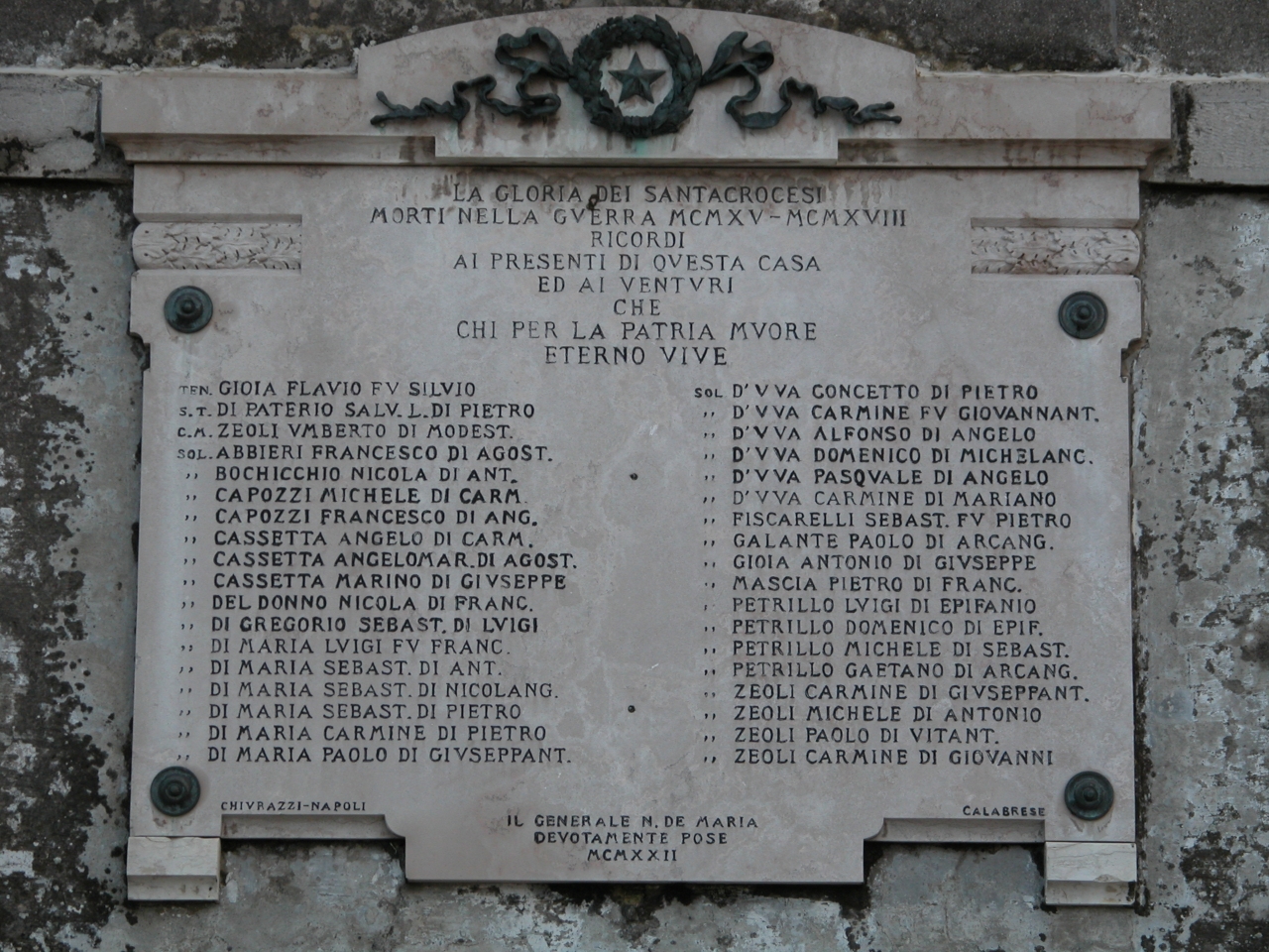 - ISCRIZIONI nel campo - LA GLORIA DEI SANTACROCESI/ MORTI NELLA GUERRA MCMXV-MCMXVIII/ RICORDI/ AI PRESENTI DI QUESTA CASA/ ED AI VENTURI/ CHE/ CHI PER LA PATRIA MUORE/ ETERNO VIVE/ GIOIA FLAVIO FU SILVIO/ S. T. DI PATERIO SALV. L. DI PIETRO/ C. M. ZEOLI UMBERTO DI MODEST./ SOL. ABBIERI FRANCESCO DI AGOST./ ‘ ‘ BOCHICCHIO NICOLA DI ANT./ ‘ ‘ CAPOZZI MICHELE DI CARM./ ‘ ‘ CAPOZZI FRANCESCO DI ANG./ ‘ ‘ CASSETTA ANGELO DI CARM./ ‘ ‘ CASSETTA ANGELOMAR. DI AGOST./ ‘ ‘ CASSETTA MARINO DI GIUSEPPE/ ‘ ‘ DEL DONNO NICOLA DI FRANC./ ‘ ‘ DI GREGORIO SEBAST. DI LUIGI/ ‘ ‘ DI MARIA LUIGI FU FRANC./ ‘ ‘ DI MARIA SEBAST. DI ANT./ ‘ ‘ DI MARIA SEBAST. DI NICOLANG./ ‘ ‘ DI MARIA SEBAST. DI PIETRO/ ‘ ‘ DI MARIA CARMINE DI PIETRO/ ‘ ‘ DI MARIA PAOLO DI GIUSEPPANT./ SOL. D’UVA CONCETTO DI PIETRO/ ‘ ‘ D’UVA CARMINE FU GIOVANNANT./ D’UVA ALFONSO DI ANGELO/ D’UVA DOMENICO DI MICHELANG./ ‘ ‘ D’UVA PASQUALE DI ANGELO/ ‘ ‘ D’UVA CARMINE DI MARIANO/ ‘ ‘ FISCARELLI SEBAST. FU PIETRO/ ‘ ‘ GALANTE PAOLO DI ARCANG./ ‘ ‘ GIOIA ANTONIO DI GIUSEPPE/ ‘ ‘ MASCIA PIETRO DI FRANC./ ‘ ‘ PETRILLO LUIGI DI EPIFANIO/ ‘ ‘ PETRILLO DOMENICO DI EPIF./ ‘ ‘ PETRILLO MICHELE DI SEBAST./ ‘ ‘ PETRILLO GAETANO DI ARCANG./ ‘ ‘ ZEOLI CARMINE DI GIUSEPPANT./ ‘ ‘ ZEOLI MICHELE DI ANTONIO/ ‘ ‘ ZEOLI PAOLO DI VITANT./ ‘ ‘ ZEOLI CARMINE DI GIOVANNI/ CHIURAZZI – NAPOLI/ IL GENERALE N. DE MARIA/ DEVOTAMENTE POSE/ MCMXXII/ CALABRESE// - lettere capitali -