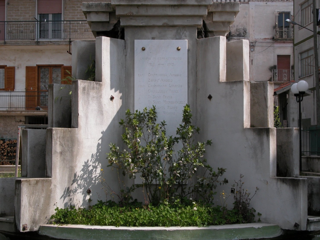 - ISCRIZIONI lato anteriore - CADUTI IN COMBATTIMENTO/1915 – 1918/ CAP. CORTELLESSA ANGELO/ ‘’ ZOMPA ANGELO/ SOLD. CAMPOPIANO LORENZO/ ‘’ CORTELLESSA FELICE/ ‘’ DI SANO FELICE/ ‘’ DI SANO MICHELANGELO/ ‘’ FRANGENTE PIETRO/ ‘’ […] MICHELE// - lettere capitali -