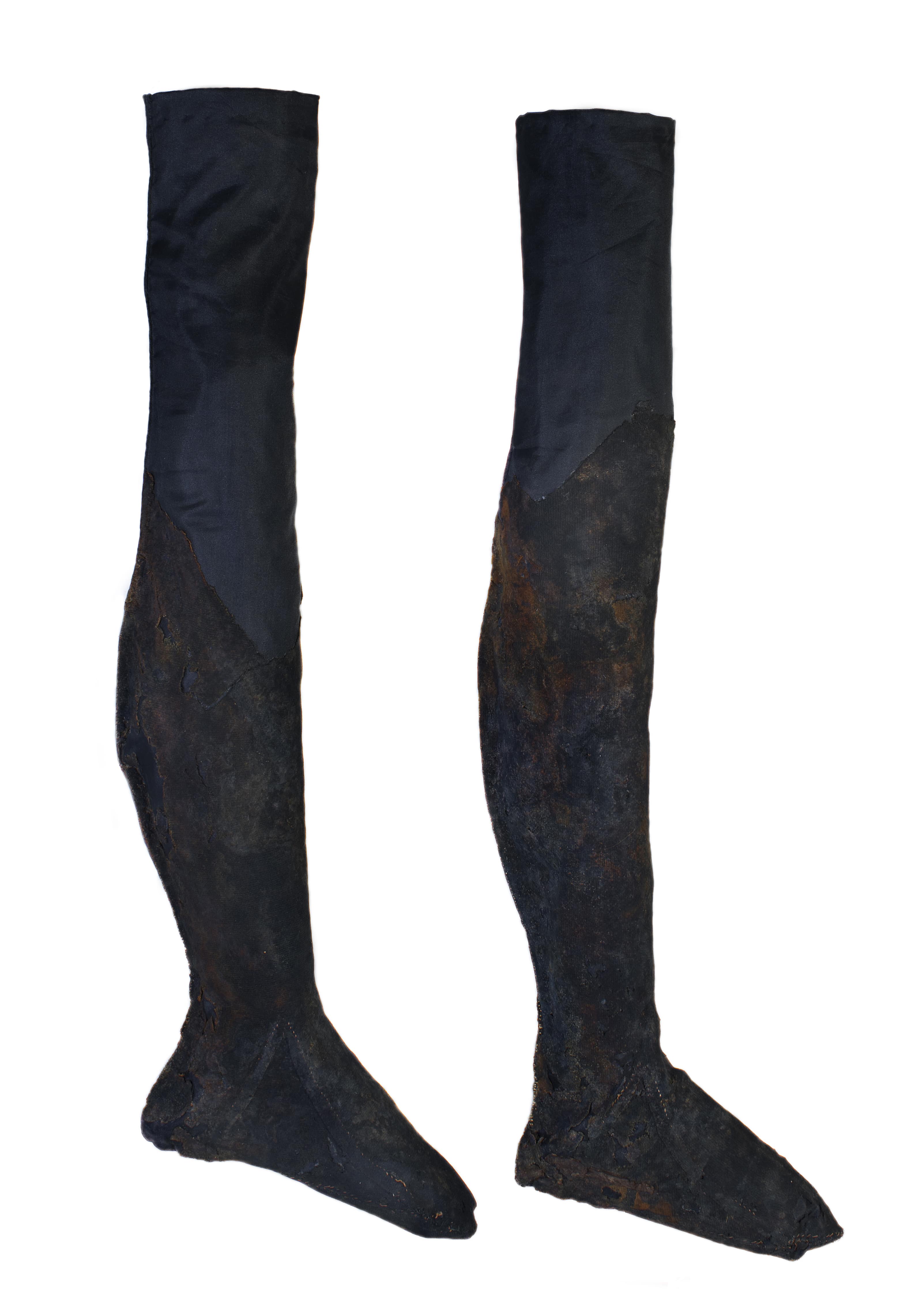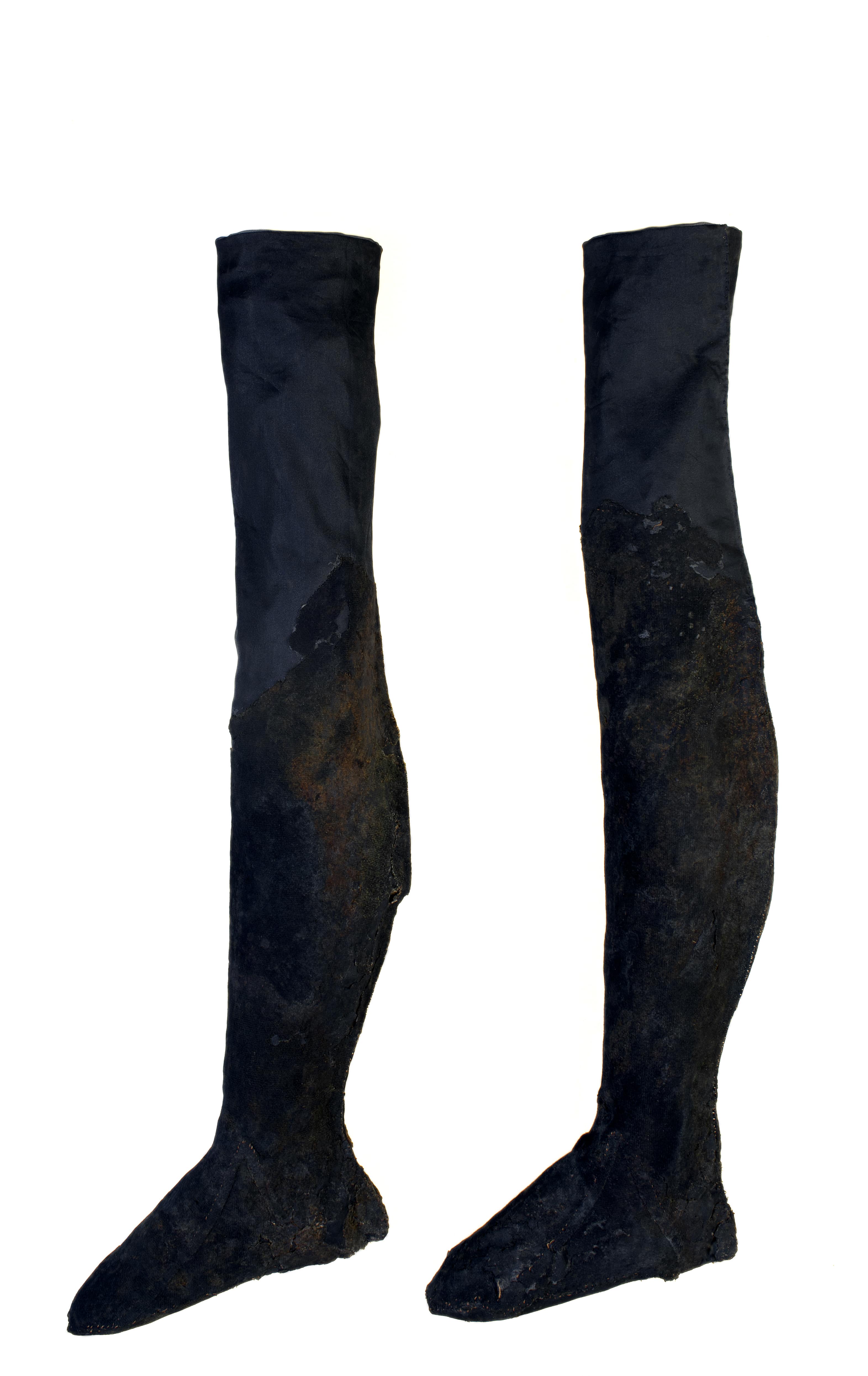 Calze con pianta sagomata e, ai lati, gheroni triangolari. Confezione particolare del piede: la suola, allargata sotto la parte anteriore del piede, finisce a punta sul tallone con una cucitura che sembra poco pratica