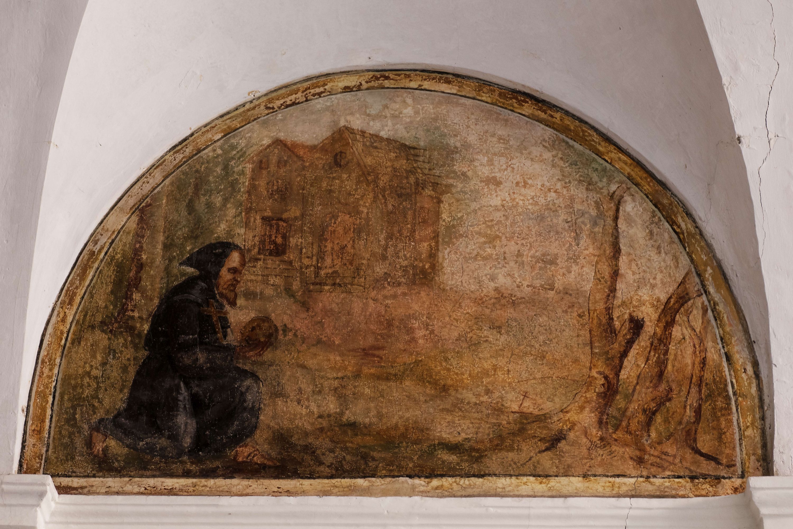 La scena descrive un frate agostiniano che, genuflesso, reca in mano un teschio e un crocifisso. Tronchi d'albero sulla destra costituiscono una quinta scenica mentre sullo sfondo è posta una costruzione architettonica, probabilmente una chiesa