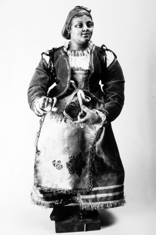 occhi in vetro; bordino dorato; lino bianco; gallone; fiocchetti rossi
