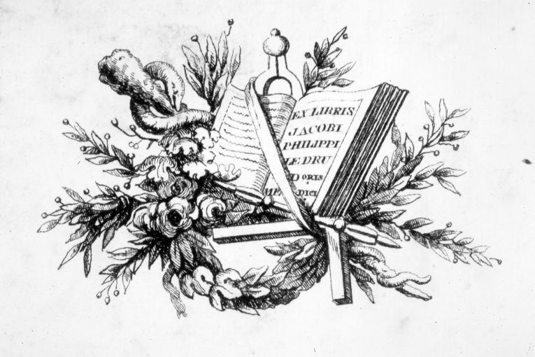 - ISCRIZIONI sulla pagina del libro - EX LIBRIS / JACOBI / PHILIPPI / LEDRU / D.ORIS / MEDICI - lettere capitali -