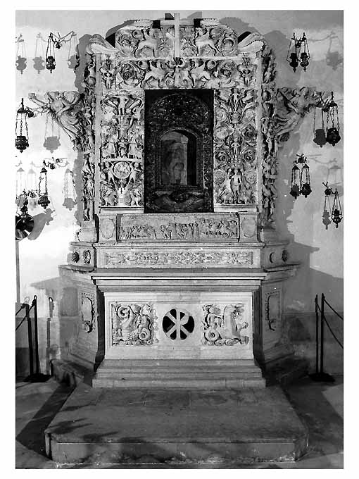 Gradinata d'altare ad angoli spezzati; paliotto e specchiature laterali scolpiti; gradini d'altare e mostra finemente scolpiti