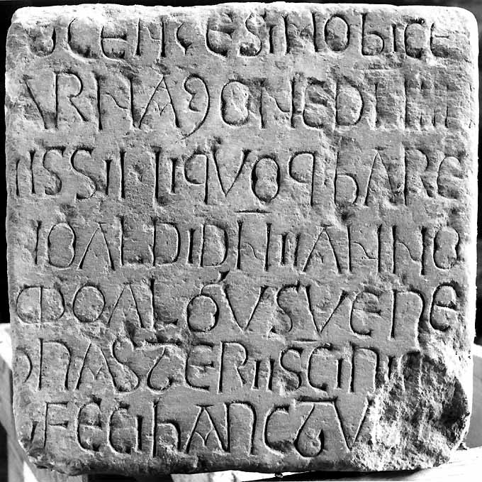 - ISCRIZIONI nello specchio epigrafico - OCENTESIMO BICE/ (INC)ARNATIONE DI IIII/ (P)IISSIMI QUOQ(UE) BARE(NSES)/ (GRIM)OALDI DN II ANNO/ MOALDUS VENE/ ONASTERII SC N / FECI HANC TU(MULUM ) - lettere capitali - a incisione -