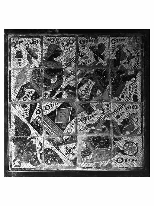 Pannello; Scena mitologica: tre figure danzanti e testa di Gorgone