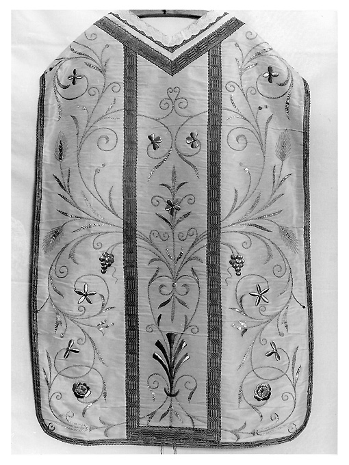 Ricamo a volute vegetali con rose e simboli eucaristici. Galloni in cannellato di seta gialla. Taffetas rosso