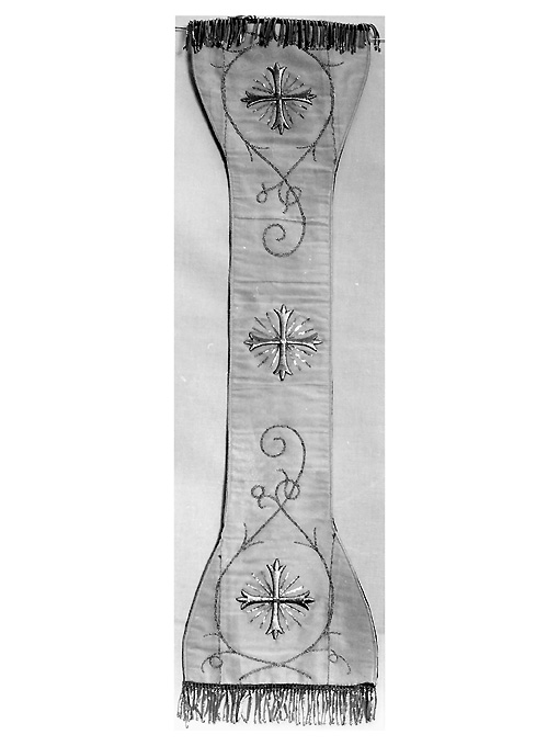 Tessuto con ricamo di volute vegetali e croce di Avellana raggiata. Frange alle estremità. Fodera in taffetas rosso