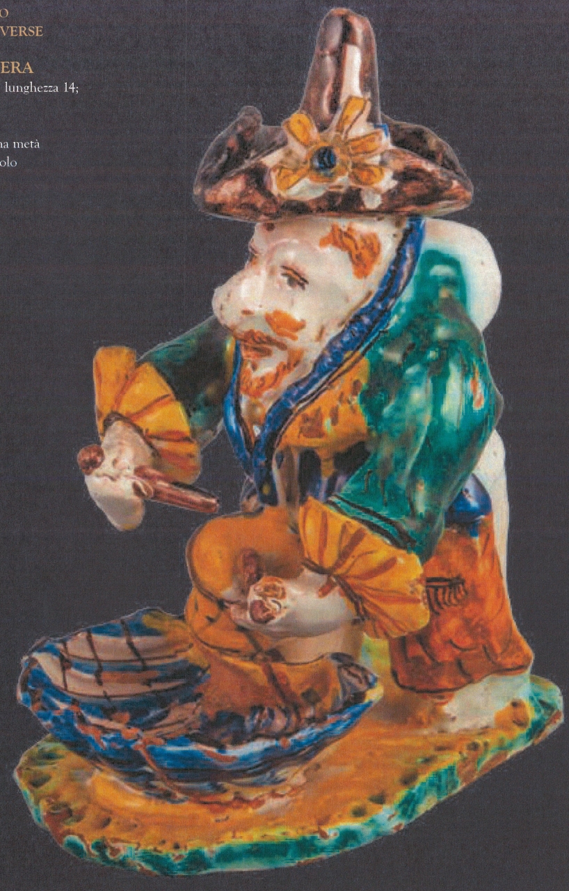 Piccola scultura a tutto tondo con base a forma elittica irregolare e piatta. Foggiatura a stampo con applicazioni e rifiniture a stecca, biscotto depurato di colore nocciola chiaro; smaltatura biancastra, eccetto che nel piano di appoggio. Decorazione in blu, arancio, verde, giallo e bruno. Rappresenta un suonatore di tamburo con giacca da parata, cappello a cono e ampia falda, fibbia a fiore. Sulla parte anteriore, piccola vasca a forma di valva di conchiglia con funzione di saliera