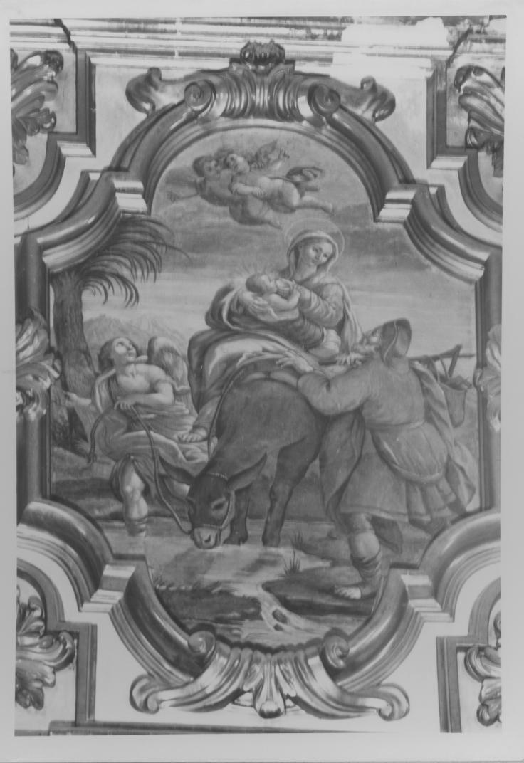 - NOTIZIE STORICO CRITICHE L'episodio della fuga in Egitto e' parte integrante del ciclo delle stori e della Vergine, che decorano il piano delle finestre, opera di Anselmo P almieri, artista di ambito napoletano attivo nella prima meta' del XVIII s ecolo. Cosi' come gli altri episodi, questo e' stato ridipinto nel 1866 in occasione della risistemazione della cattedrale
