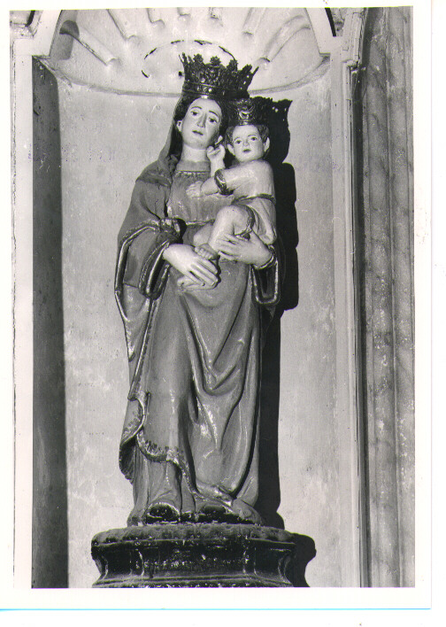 La Madonna è raffigurata in piedi con il manto azzurro e la veste rosa bordati in oro. Fra le sue braccia il Gesù bambino benedicente, con una veste gialla con profili dorati. Sul capo, entrambe le figure indossano corone