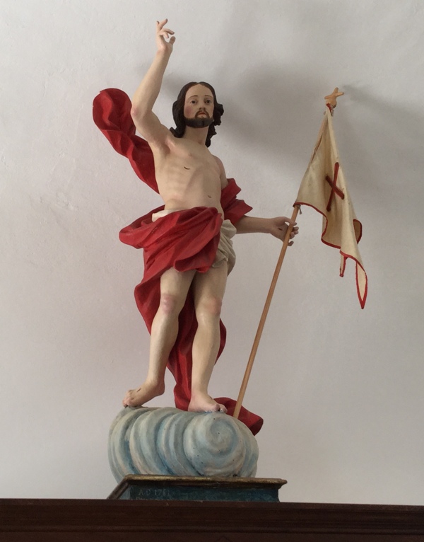 Gesù Cristo, a figura intera, è in piedi su una nuvola che poggia su un basamento in legno quadrangolare. Il Cristo ha gli occhi di vetro,la gamba destra flessa all'indietro e benedice levando in alto il braccio destro. Indossa un perizoma chiaro annodato sul davanti ed un manto rosso che circonda il braccio sinistro per poi ricadere alle sue spalle verso il basso. Alla sua sinistra il vessillo di rosso crociato