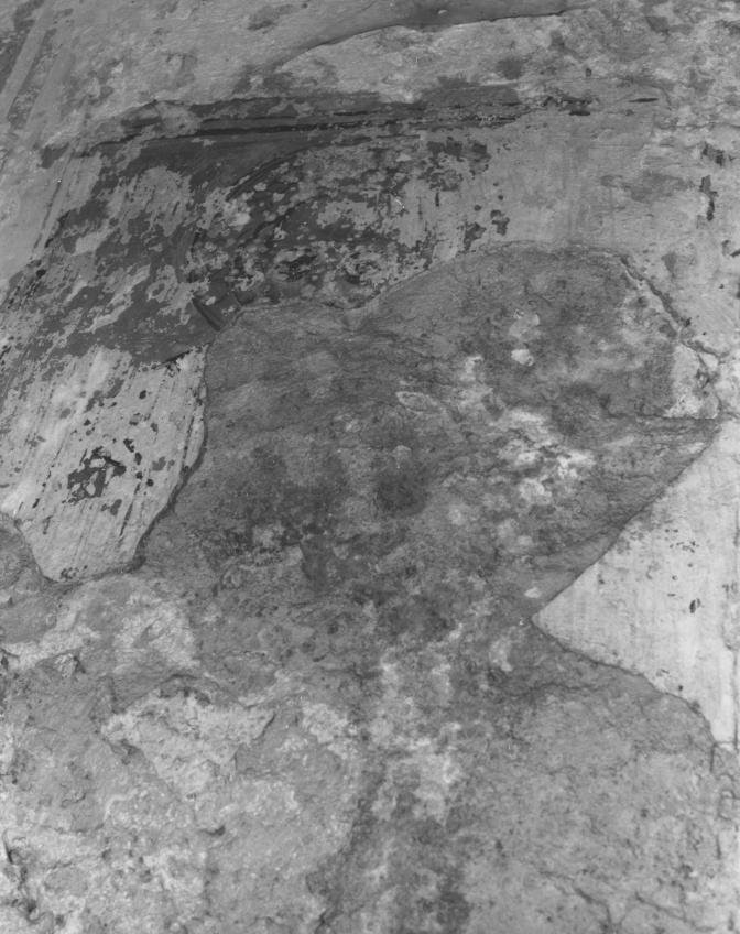 l'affresco, in scala monumentale allo stato originario, è oggi ridotto ascarsi frammenti. Della figura si sono potuti identificare tratti dellatunica bianca e del mantello grigio-scuro; il volto è pressocchèinvisibile; fortunatamente superstite l'attributo iconograficocaratterizzante la rappresentazione del santo, le catene, simbolo del suopatronato sui prigionieri