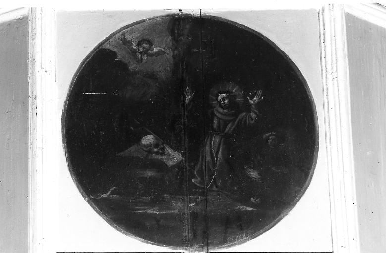 Personaggi: San Francesco d'Assisi. Attributi: (San Francesco d'Assisi) teschio; stimmate. Figure: cherubino. Paesaggi: paesaggio roccioso. Fenomeni divini