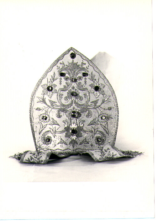 La mitria, in seta bianca, è ricamata a motivi floreali e ornata da pietre dure. Lungo i bordi è rifinita da passamaneria dorata. Le infule, terminanti con frangia dorata, sono anch'esse ornate da motivi floreali